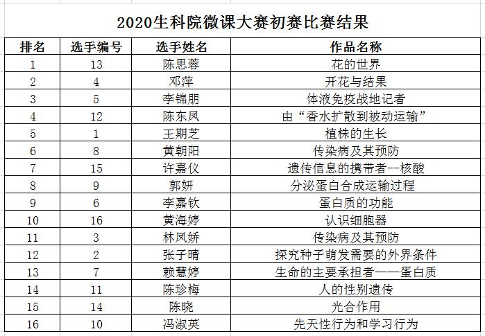 经员工自由参赛,生科院2020年师范生微课大赛初赛评委组评分、组委会审核无误,公司拟推荐以下同学参加BWIN必赢2020年师范生微课大赛,特此公示。