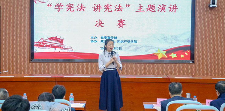 由党委宣传部主办,政法学院、知识产权学院协办的“学宪法 讲宪法”主题演讲比赛当天举行。经过此前预赛的角逐,18名选手脱颖而出进入决赛,其中非专业组14名,专业组4名。决赛现场,各选手结合典型案例,围绕“宪法与国家”“宪法与社会”“宪法与个人”三个主题,讲述发生关于宪法的故事,阐释他们对宪法的理解,表达维护宪法、遵守宪法、敬畏宪法,共同建设文明法治中国的理想和决心。最后,来自政法学院、知识产权学院的陈野菁、刘瀚泽分别斩获非专业组和专业组的第一名。