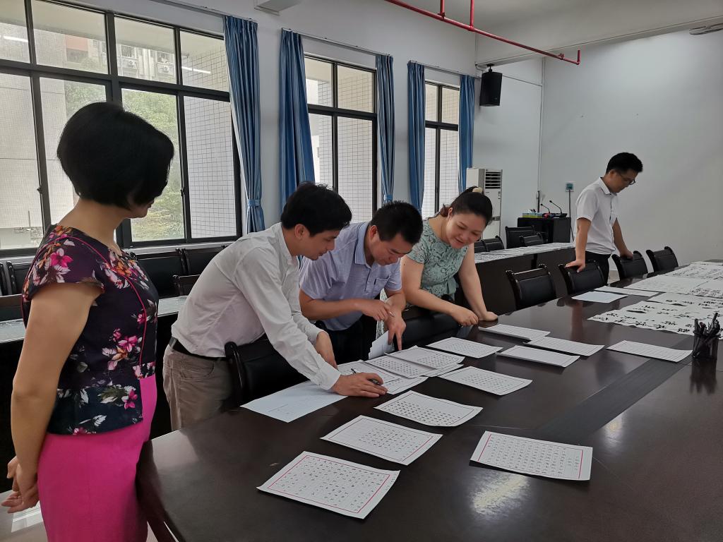 30分钟过后,书法大赛决赛结束。比赛进入作品评审阶段。评委们开始认真评审作品,最终评选出毛笔、钢笔、粉笔字一、二、三等奖和优秀奖。