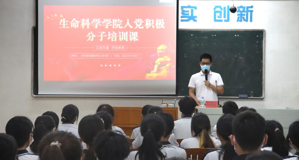 2022年5月20日晚上,学习贯彻习近平总书记在庆祝中国共产主义青年团成立100周年大会重要讲话精神暨入党积极分子培训党课在第二教学楼214教室举行。党课由党委副书记邱兴和主讲,72名入党积极分子参加培训。
