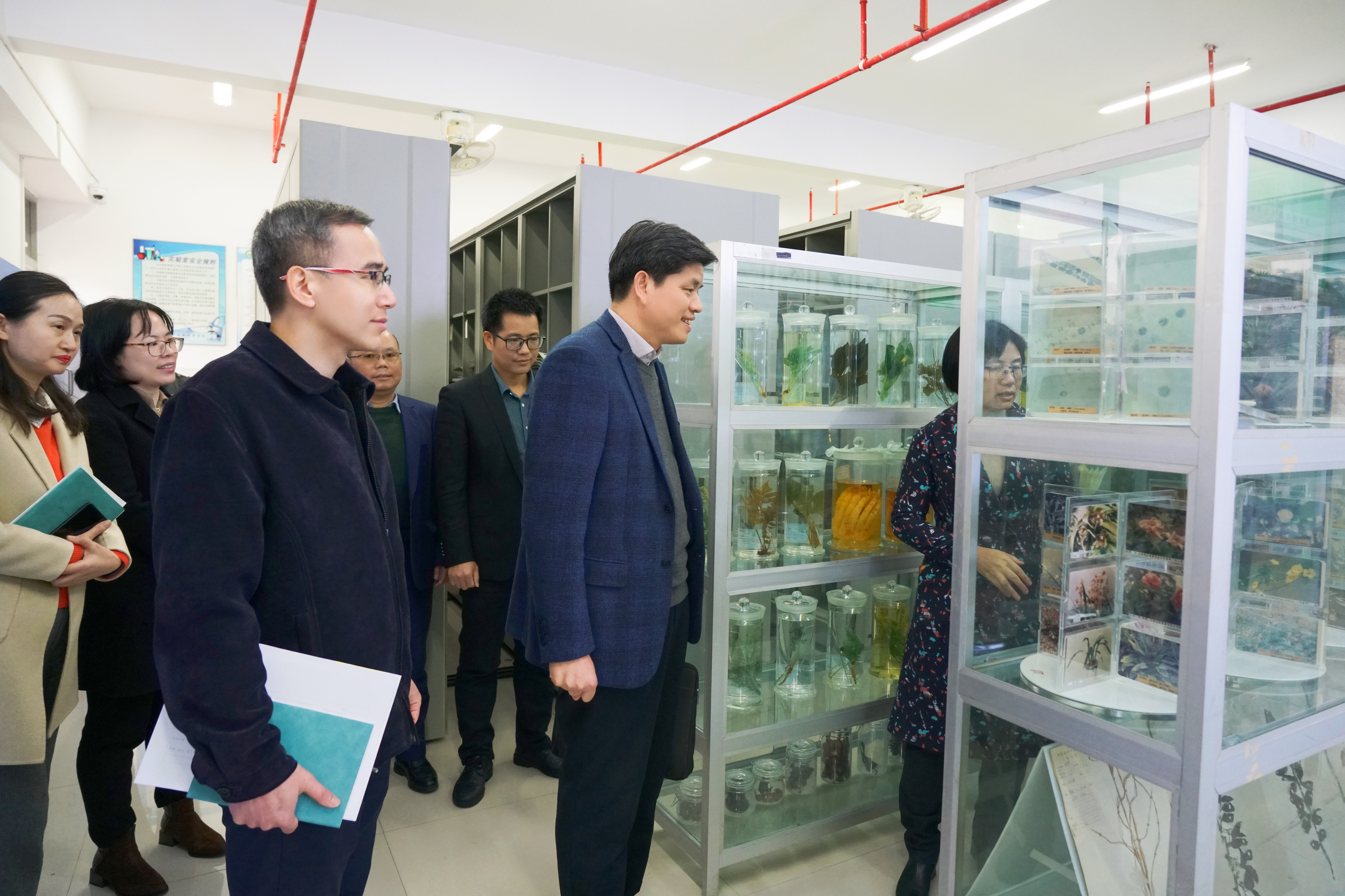 座谈会后,欧洪湛走访生科院教师办公室,参观动植物标本室,对生命科学与健康教育基地的发展规划提出建议。