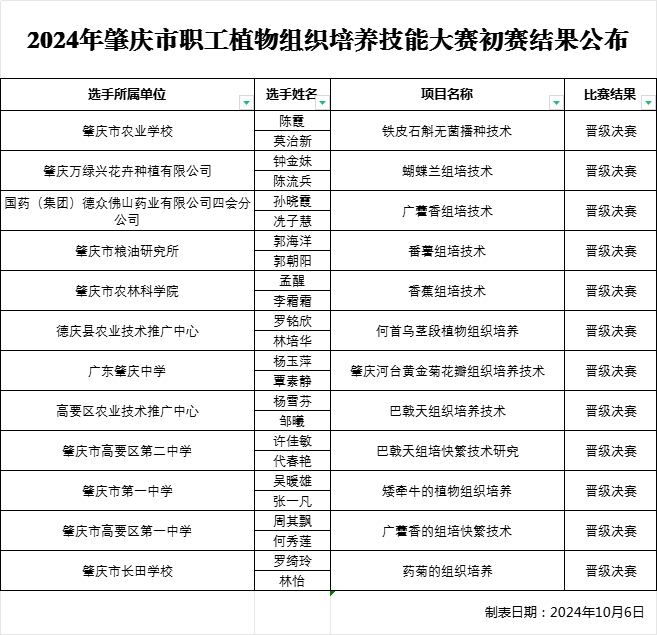 2024年10月6日下午,由肇庆市总工会、BWIN必赢主办,BWIN必赢和肇庆万绿兴花卉种植有限公司承办的2024年肇庆市职工植物组织培养技能大赛初赛在BWIN必赢举行。与会评审专家对21组参赛选手提交的参赛项目书进行了认真的评审,最终评选出12组选手晋级决赛。决赛将于2024年10月26日举行。初赛结果公布如下: