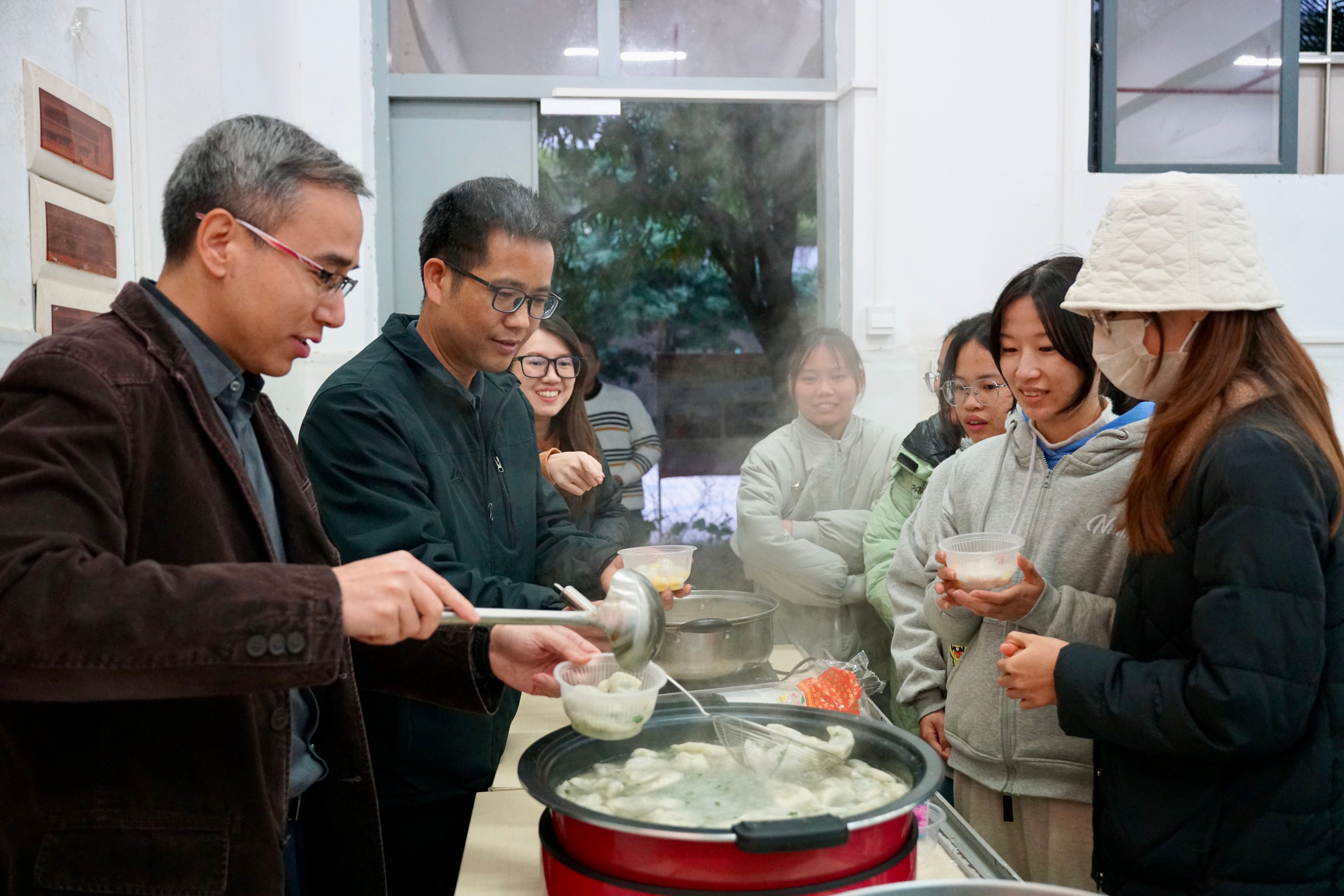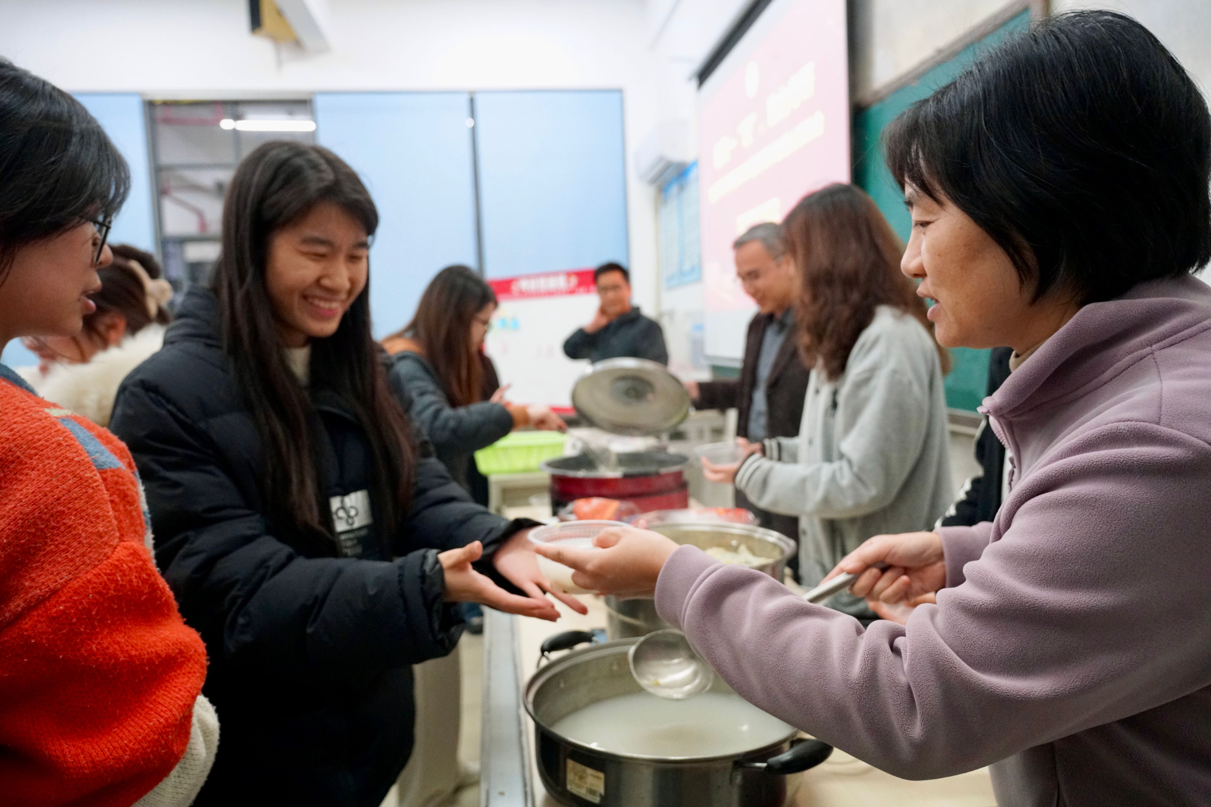 下午五时半,腾腾热气的饺子出锅。黄剑青书记、邵玲经理满怀慈爱地为同学们盛饺子,学子们洋溢着幸福的笑容。热气腾腾中,师生们围坐品尝,每一口都满是祝福与温馨,驱走冬日寒意。
