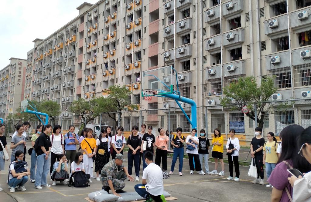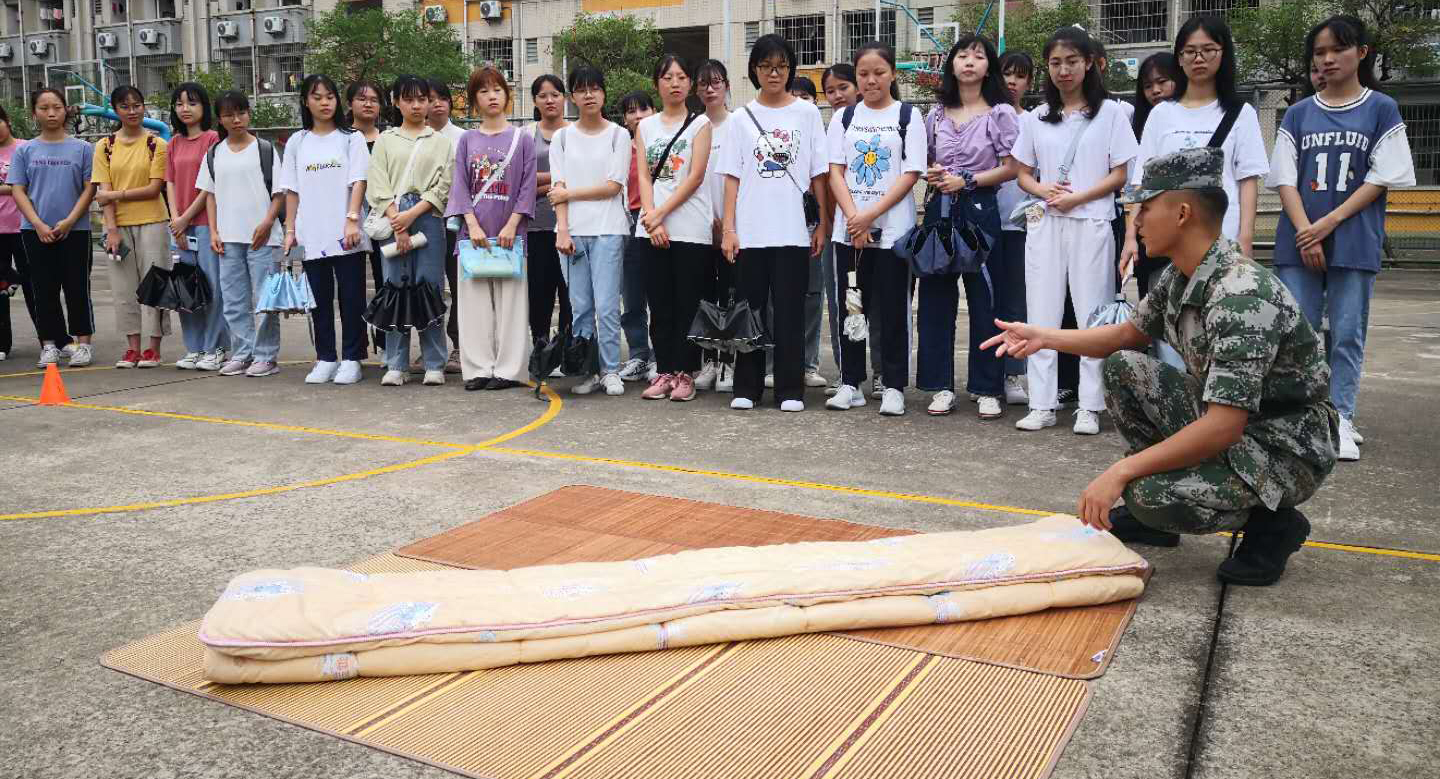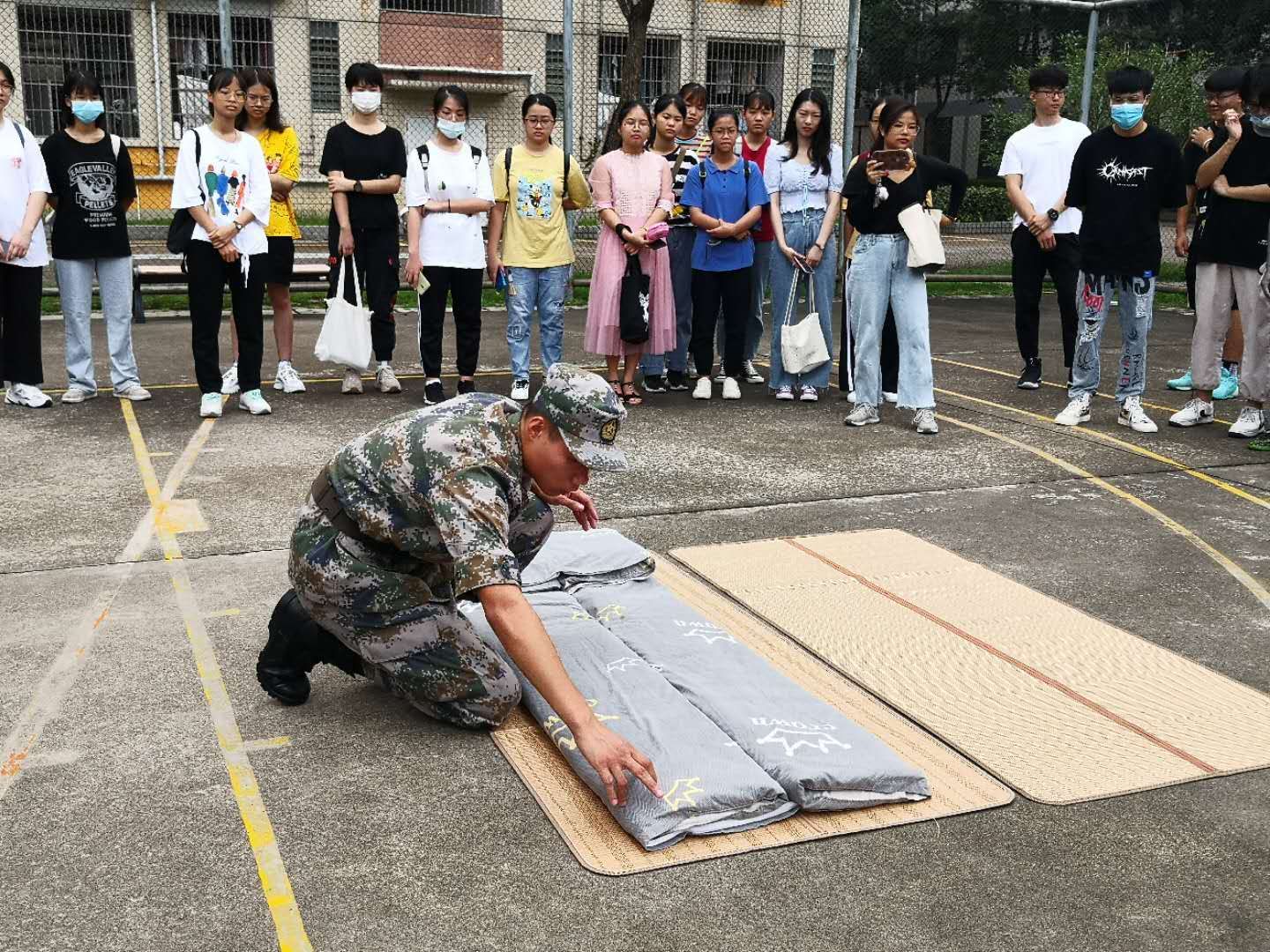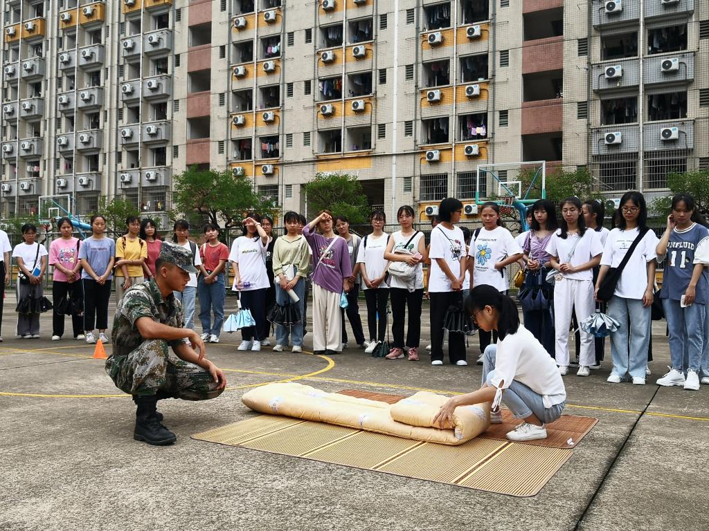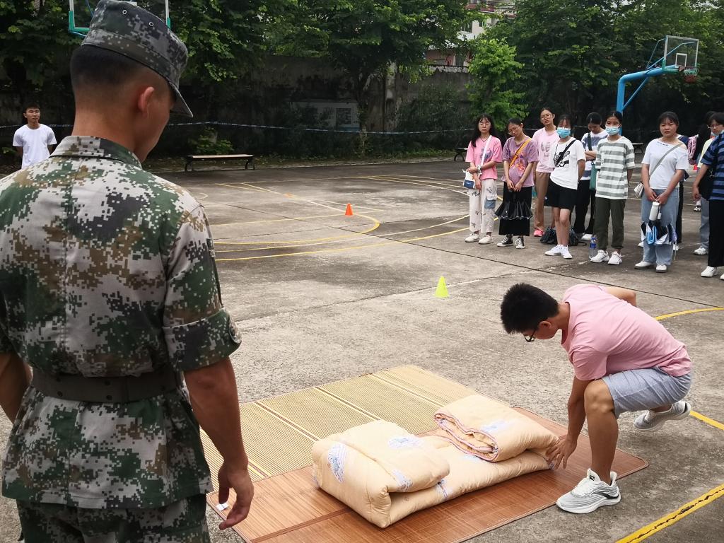 本网讯 为使2020级新生更好的适应老员工活,严格律己,营造良好的宿舍环境,近日,公司在明智书院篮球场组织开展退伍兵指导新生整理内务活动。