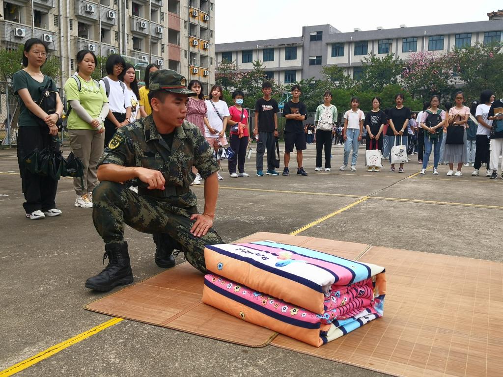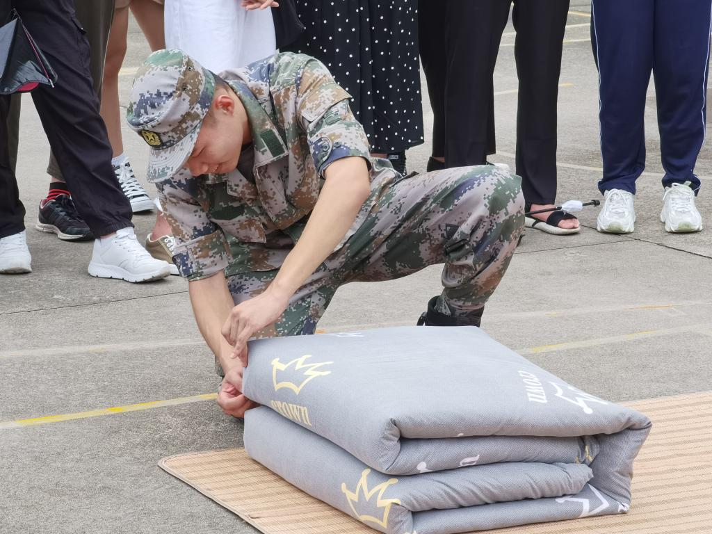 退伍兵进行分步骤演示,并将叠被子的关键步骤向同学们进行了详细的讲述,强调了叠军被的重点及动作要领,经过虚部掏平、压平、两次对折等步骤,“豆腐块”的大体形状便出现了,再经过 “三分叠七分修”的工作之后,标准的军被便呈现在大家眼前,赢得在场的2020级新生热烈掌声。